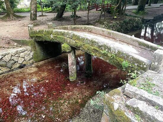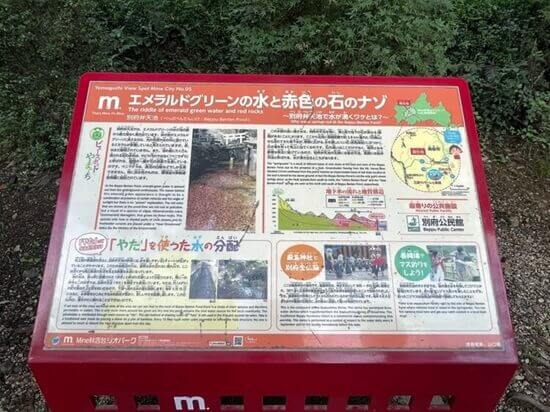 青色の池に圧倒されて見落としていたのですが、この案内板を読んで池から流れ出る小川に目をやると、なんとその川底の一部が赤く染まっているように見える場所があったんです!